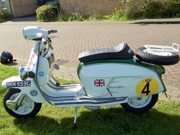 Bought as an SX 200 in white, I wanted to build an S type replica. Engine TS1 225 barrel kit with high compression head, AF crank, Reedvalve, 32mm Dellorto flatside carb, SX200 gearbox with 16 tooth front sprocket. KRP 1 Kegra Exhaust, wide rims front and rear with S1 350/10 Tyres. The scooter has completed various rallies over the years including the Lambretta club coast to coast several times and the Lambretta club IOM events.